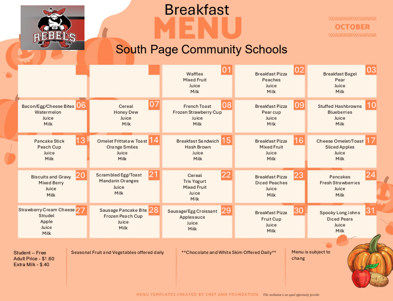 2025-2026 Breakfast Serving Times Hot breakfast is served from 7:30 a.m. to 7:50 a.m. From 7:50 a.m. to 7:55 a.m., students will be served a grab-and-go breakfast. No breakfast will be served after 7:55 a.m. Students are expected to be in their classrooms, and class activities begin at 8:00 a.m. If your child wishes to eat breakfast at school, please make arrangements to get to school early enough to have time to eat breakfast and then report to class by 8:00 a.m. |